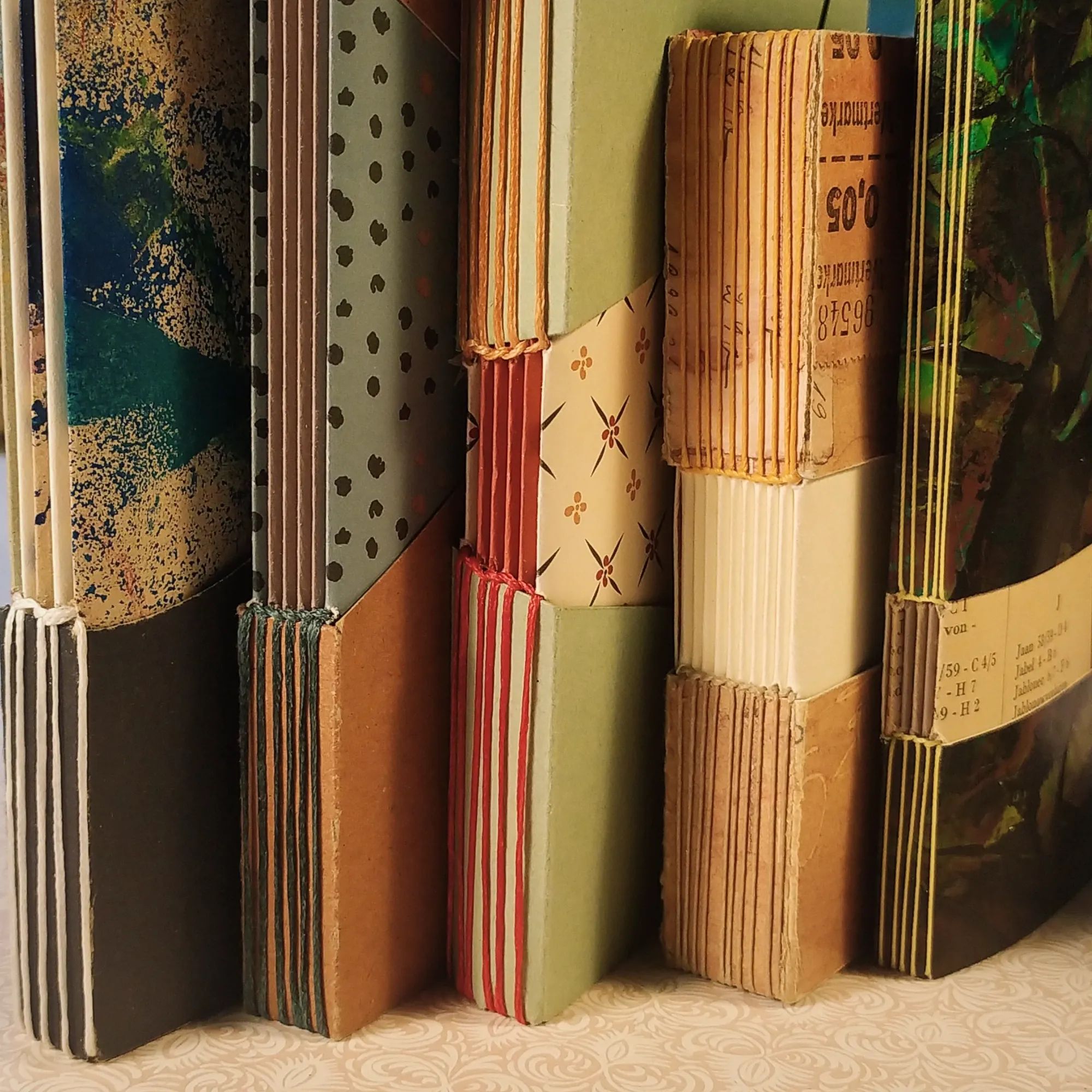 Wir gestalten und binden individuelle Bücher mit einer dekorativen Öffnung am Buchrücken. Jedes Buch ist anders und einzigartig. Aus alten Buchseiten, Kalenderblättern, Zeitschriften und verschiedenen Papieren werden einzelne Lagen ineinandergesteckt und vernäht. Diese Bindung funktioniert ganz ohne Kleben. Das Ergebnis lässt sich wunderbar als Skizzen- oder Reisetagebuch verwenden, oder auch für Rezepte und Notizen.